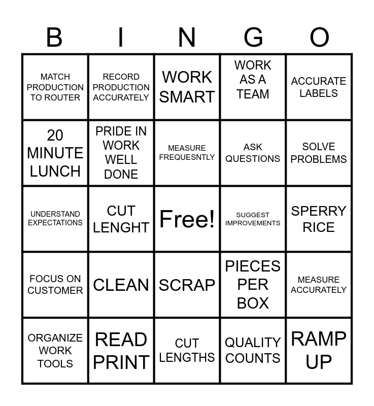 This bingo card has a free space and 28 words: MEASURE ACCURATELY, BONUS, ASK QUESTIONS, QUALITY COUNTS, 20 MINUTE LUNCH, WORK SMART, RECORD PRODUCTION ACCURATELY, FOCUS ON CUSTOMER, SUGGEST IMPROVEMENTS, ORGANIZE WORK TOOLS, UNDERSTAND EXPECTATIONS, WORK AS A TEAM, READ PRINT, CUT LENGTHS, SOLVE PROBLEMS, WATCH BREAK TIMES, CLEAN, PRIDE IN WORK WELL DONE, MEASURE FREQUESNTLY, SCRAP, MATCH PRODUCTION TO ROUTER, INSPECT YOUR WORK, RAMP UP, CUT LENGHT, SPERRY RICE, PIECES PER BOX, ACCURATE LABELS and VISUAL INSPECTION.