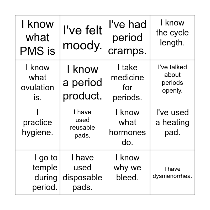 This bingo card has 16 words: I go to temple during period., I have used disposable pads., I've had period cramps., I know the cycle length., I know what ovulation is., I've felt moody., I know what hormones do., I've used a heating pad., I know what PMS is, I know a period product., I know why we bleed., I've talked about periods openly., I practice hygiene., I have used reusable pads., I take medicine for periods. and I have dysmenorrhea..