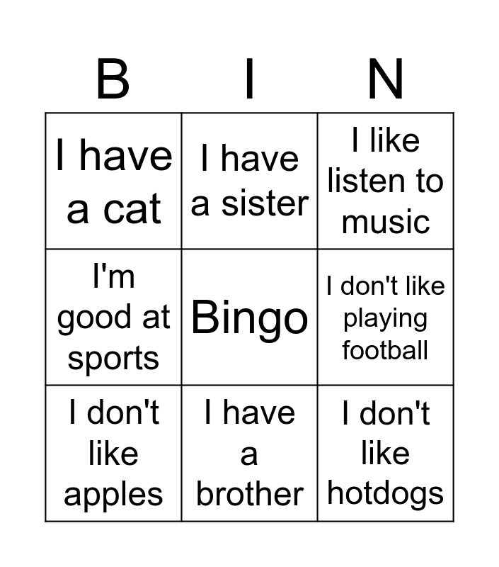 This bingo card has a free space and 14 words: I like pizza, I have a dog, I don't like apples, I have a sister, I'm good at sports, I don't like hotdogs, I like movies, I like playing football, I have a brother, I have a cat, I like eggs, I don't like playing football, I like listen to music and I play basketball.