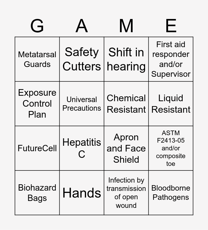 This bingo card has 16 words: Hands, ASTM F2413-05 and/or composite toe, Shift in hearing, Metatarsal Guards, FutureCell, Safety Cutters, Apron and Face Shield, Infection by transmission of open wound, Exposure Control Plan, Universal Precautions, Biohazard Bags, First aid responder and/or Supervisor, Hepatitis C, Liquid Resistant, Chemical Resistant and Bloodborne Pathogens.