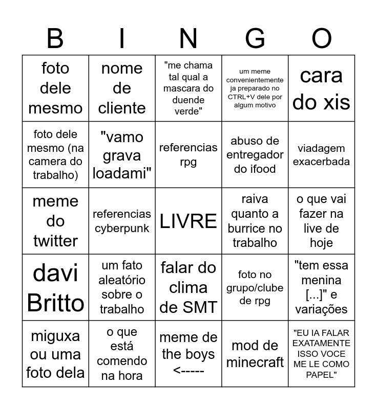 This bingo card has a free space and 24 words: um fato aleatório sobre o trabalho, o que está comendo na hora, referencias rpg, miguxa ou uma foto dela, cara do xis, foto dele mesmo, foto dele mesmo (na camera do trabalho), nome de cliente, raiva quanto a burrice no trabalho, falar do clima de SMT, abuso de entregador do ifood, meme do twitter, foto no grupo/clube de rpg, "tem essa menina [...]" e variações, "vamo grava loadami", mod de minecraft, o que vai fazer na live de hoje, "me chama tal qual a mascara do duende verde", viadagem exacerbada, referencias cyberpunk, "EU IA FALAR EXATAMENTE ISSO VOCE ME LE COMO PAPEL", davi Britto, um meme convenientemente ja preparado no CTRL+V dele por algum motivo and meme de the boys <-----.