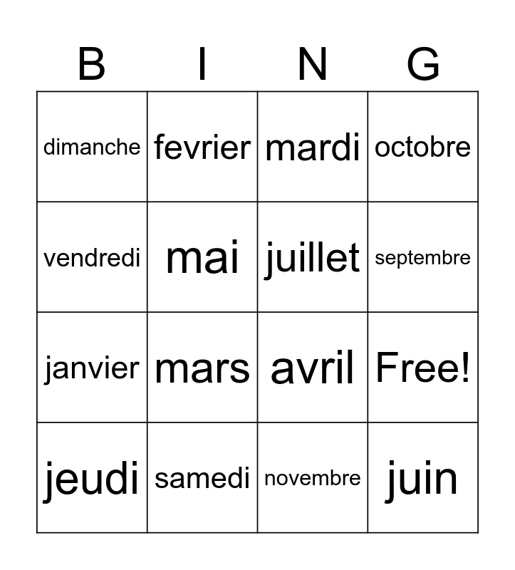 This bingo card has 20 words: Free!, lundi, mardi, mercredi, jeudi, vendredi, samedi, dimanche, janvier, fevrier, mars, avril, mai, juin, juillet, aout, septembre, octobre, novembre and decembre.