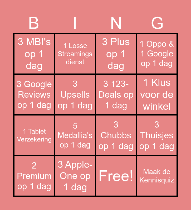 This bingo card has 17 words: Free!, 2 Premium op 1 dag, 3 Plus op 1 dag, 3 MBI's op 1 dag, 5 Medallia's op 1 dag, 1 Oppo & 1 Google op 1 dag, 3 Thuisjes op 1 dag, 3 123-Deals op 1 dag, 1 Klus voor de winkel, 3 Upsells op 1 dag, 3 Apple-One op 1 dag, 3 Chubbs op 1 dag, 3 Google Reviews op 1 dag, 1 Losse Streamings dienst, 1 Tablet Verzekering, Zakelijk 3 jaar Unli Plus of Premium and Maak de Kennisquiz.