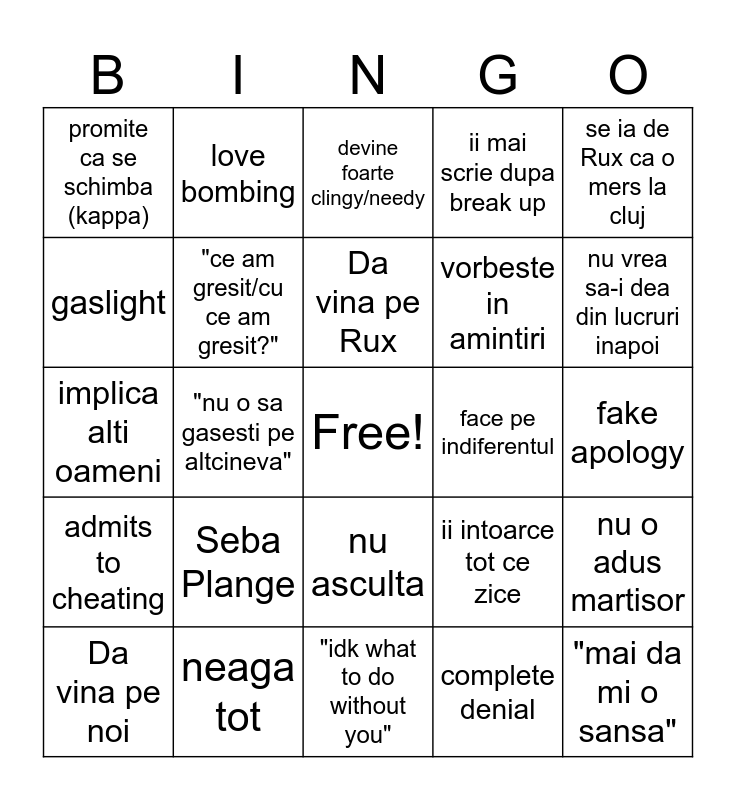 This bingo card has a free space and 24 words: Seba Plange, neaga tot, Da vina pe Rux, Da vina pe noi, se ia de Rux ca o mers la cluj, promite ca se schimba (kappa), gaslight, love bombing, face pe indiferentul, nu asculta, vorbeste in amintiri, implica alti oameni, ii intoarce tot ce zice, nu o adus martisor, "ce am gresit/cu ce am gresit?", complete denial, fake apology, devine foarte clingy/needy, nu vrea sa-i dea din lucruri inapoi, "nu o sa gasesti pe altcineva", "mai da mi o sansa", admits to cheating, ii mai scrie dupa break up and "idk what to do without you".