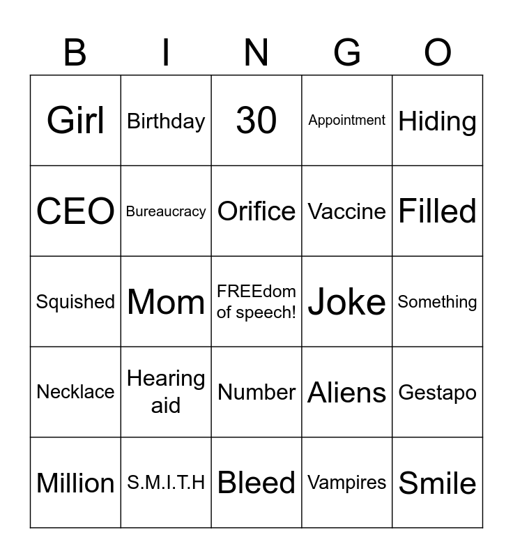This bingo card has a free space and 45 words: Who, Smile, Big Mac, Million, Dirt, Vampires, 30, No, no, no, no, Hiding, S.M.I.T.H, Appointment, Joke, Number, Hearing aid, Talons, Bleed, Running, Squished, Mammy-o-gram, Filled, Birthday, Phones, Roads, Girl, Killed, Something, Cop, Badge, Aliens, Necklace, Europe, Gestapo, Sheep, Kids, Humor, Mom, Guard, Lunch, Treatments, Orifice, CEO, Vaccine, PTSD, Bureaucracy and Online.