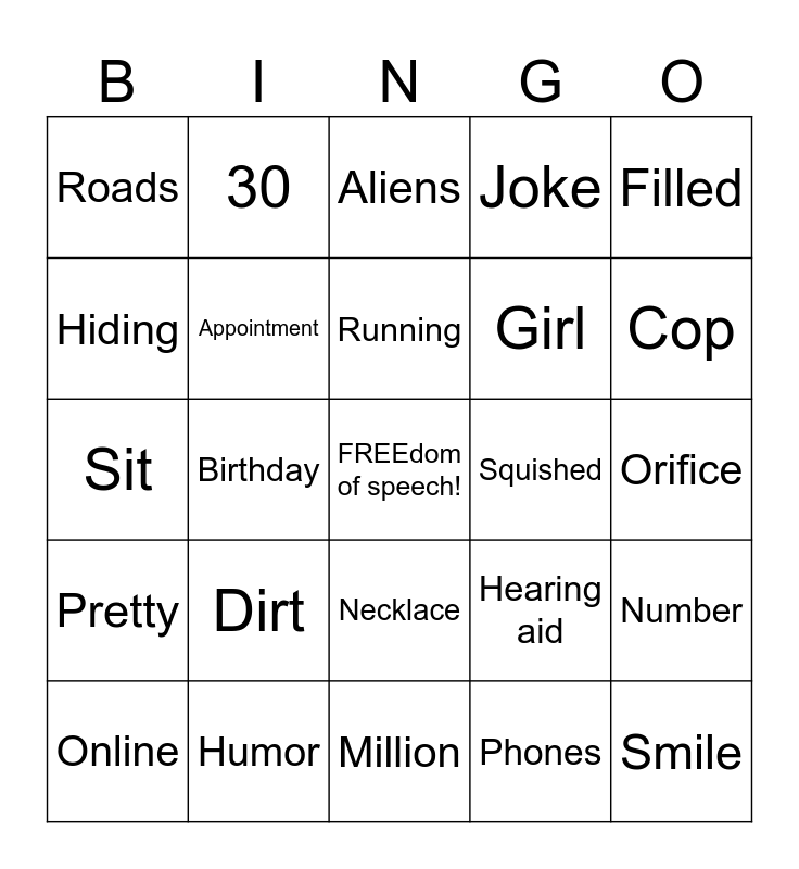 This bingo card has a free space and 50 words: Who, Smile, Big Mac, Million, Dirt, Vampires, 30, No, no, no, no, Hiding, S.M.I.T.H, Appointment, Joke, Number, Hearing aid, Talons, Bleed, Running, Squished, Mammy-o-gram, Filled, Birthday, Phones, Roads, Girl, Killed, Something, Cop, Badge, Aliens, Necklace, Europe, Gestapo, Sheep, Kids, Humor, Mom, Guard, Lunch, Treatments, Orifice, CEO, Vaccine, PTSD, Bureaucracy, Online, Sit, Checked, Help, Pretty and Bill.