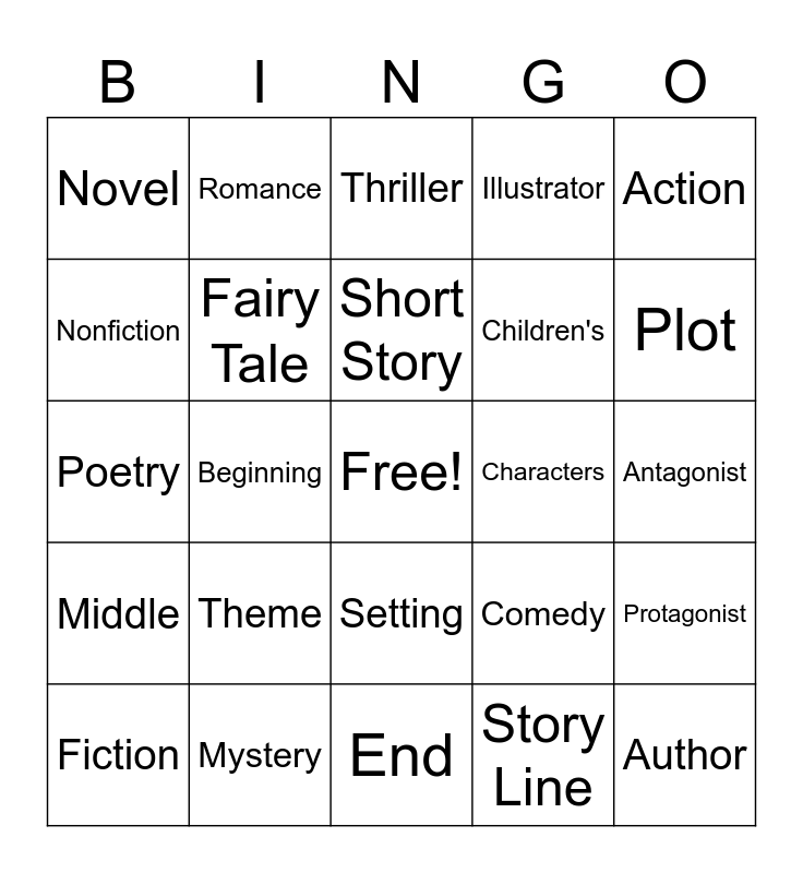 This bingo card has a free space and 24 words: Theme, Mystery, Short Story, Fiction, Action, Novel, Nonfiction, Romance, Characters, Setting, Children's, Poetry, Comedy, Protagonist, Fairy Tale, Story Line, Antagonist, Thriller, Plot, Beginning, Author, Middle, Illustrator and End.
