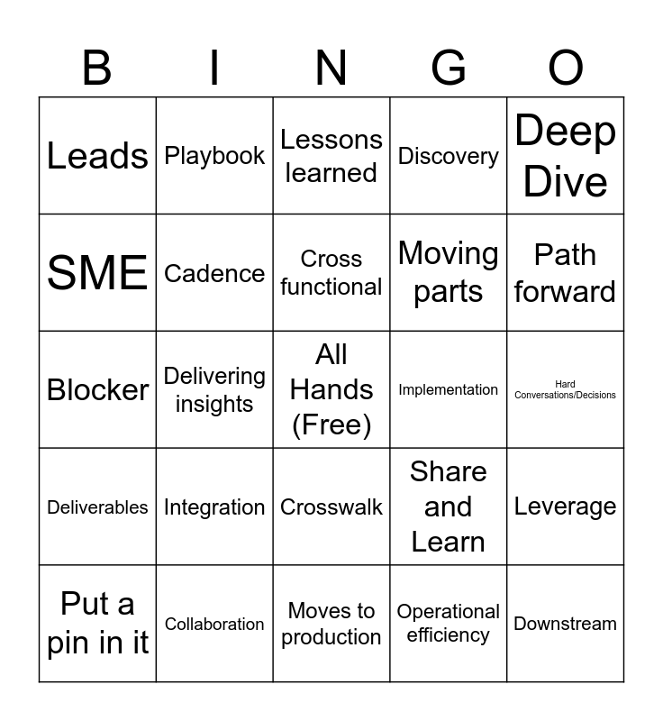 This bingo card has a free space and 41 words: Best Practice, Blocker, Business processes, Cadence, Collaboration, Crosswalk, Cross functional, Data Conversion, Deep Dive, Deliverables, Delivering insights, Discovery, Downstream, Hard Conversations/Decisions, Implementation, Integration, Journey, Leads, Legacy data, Lessons learned, Leverage, Life Cycle Testing, Moves to production, Moving parts, OC&T, Open and inclusive, Operational efficiency, Operational Readiness, Path forward, Pivot, Playbacks, Playbook, Put a pin in it, Rolling deployment, Share and Learn, SME, Stakeholders, Streamline, Validate, Workbook and Workstream.