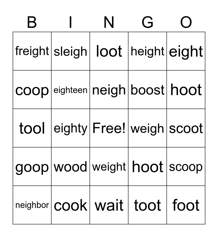 This bingo card has a free space and 24 words: wood, cook, neigh, neighbor, eight, freight, coop, sleigh, weigh, weight, boost, tool, hoot, scoop, eighteen, toot, scoot, loot, hoot, eighty, foot, goop, height and wait.