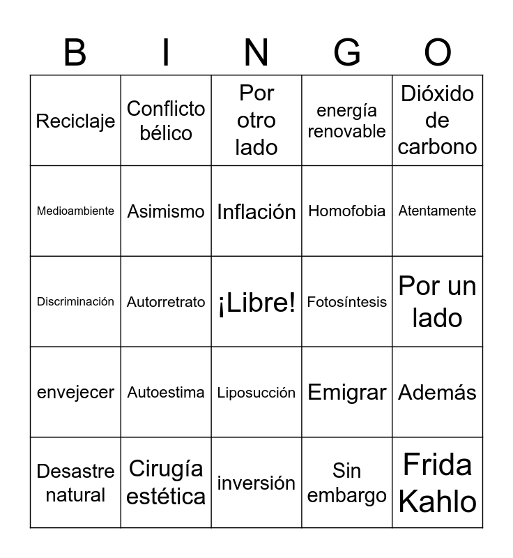 This bingo card has a free space and 24 words: Autoestima, Cirugía estética, Inflación, Desastre natural, Dióxido de carbono, Reciclaje, Medioambiente, Conflicto bélico, Fotosíntesis, Liposucción, Homofobia, Discriminación, Emigrar, Además, Asimismo, Sin embargo, Por un lado, Por otro lado, Atentamente, Autorretrato, Frida Kahlo, envejecer, energía renovable and inversión.