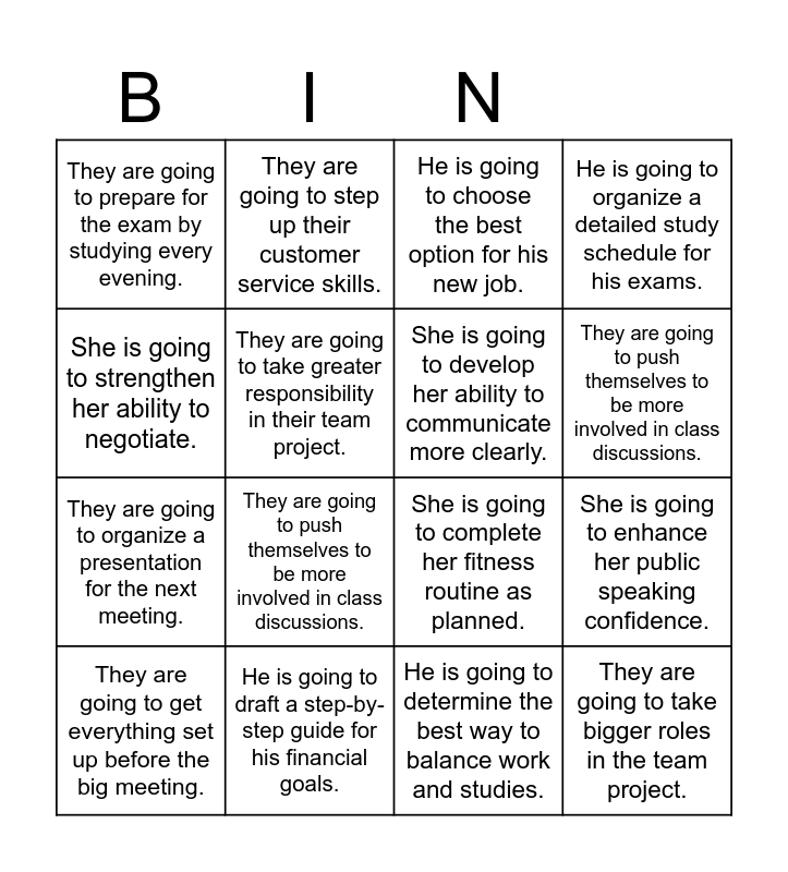 This bingo card has 20 words: She is going to enhance her public speaking confidence., She is going to make her skills better by practicing daily., He is going to choose the best option for his new job., He is going to make up his mind about which course to take soon., They are going to get everything set up before the big meeting., She is going to strengthen her ability to negotiate., He is going to draft a step-by-step guide for his financial goals., They are going to prepare for the exam by studying every evening., They are going to organize a presentation for the next meeting., They are going to step up their customer service skills., They are going to push themselves to be more involved in class discussions., She is going to complete her fitness routine as planned., They are going to take greater responsibility in their team project., They are going to take bigger roles in the team project., She is going to develop her ability to communicate more clearly., He is going to lay out a plan for his career growth., They are going to push themselves to be more involved in class discussions., He is going to organize a detailed study schedule for his exams., He is going to determine the best way to balance work and studies. and He is going to make up his mind about which course to take soon..