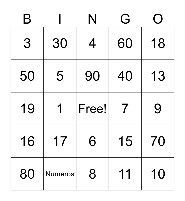 This bingo card has a free space and 30 words: Numeros, 0, 1, 2, 3, 4, 5, 6, 7, 8, 9, 10, 11, 12, 13, 14, 15, 16, 17, 18, 19, 20, 30, 40, 50, 60, 70, 80, 90 and 100.