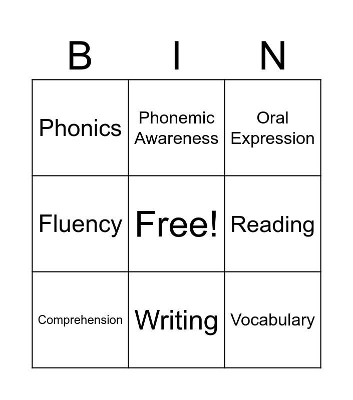 This bingo card has a free space and 8 words: Reading, Oral Expression, Phonemic Awareness, Comprehension, Phonics, Vocabulary, Fluency and Writing.