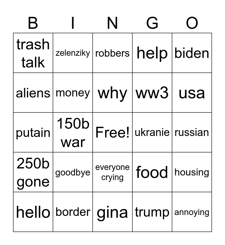 This bingo card has a free space and 24 words: hello, goodbye, why, trump, biden, trash talk, zelenziky, robbers, ukranie, russian, putain, money, food, housing, aliens, border, gina, help, usa, 250b gone, 150b war, everyone crying, ww3 and annoying.