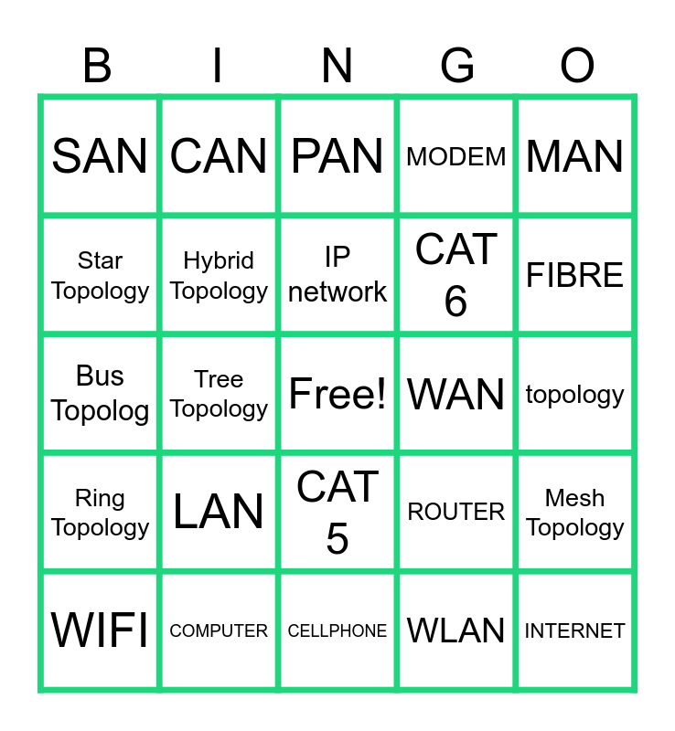 This bingo card has a free space and 24 words: WIFI, LAN, IP network, WLAN, MAN, SAN, CAN, PAN, WAN, topology, Bus Topolog, Hybrid Topology, ROUTER, Mesh Topology, Star Topology, COMPUTER, CELLPHONE, MODEM, FIBRE, Ring Topology, Tree Topology, CAT 5, CAT 6 and INTERNET.