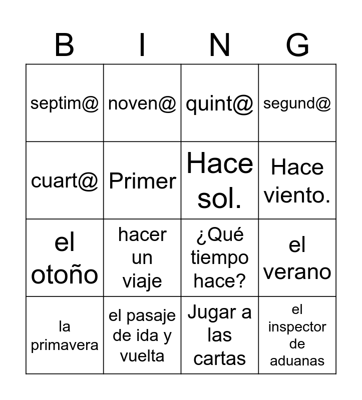 This bingo card has 27 words: hacer las maletas, ir de vacaciones, el otoño, Está muy nublado., Primer, quint@, noven@, el inspector de aduanas, el pasaje de ida y vuelta, confirmar una reservación, ¿Qué tiempo hace?, segund@, sext@, décim@, hacer un viaje, motocicleta, Hace sol., Hace viento., tercer@, septim@, Jugar a las cartas, el invierno, el verano, la primavera, Llueve (Está lloviendo)., cuart@ and octav@.