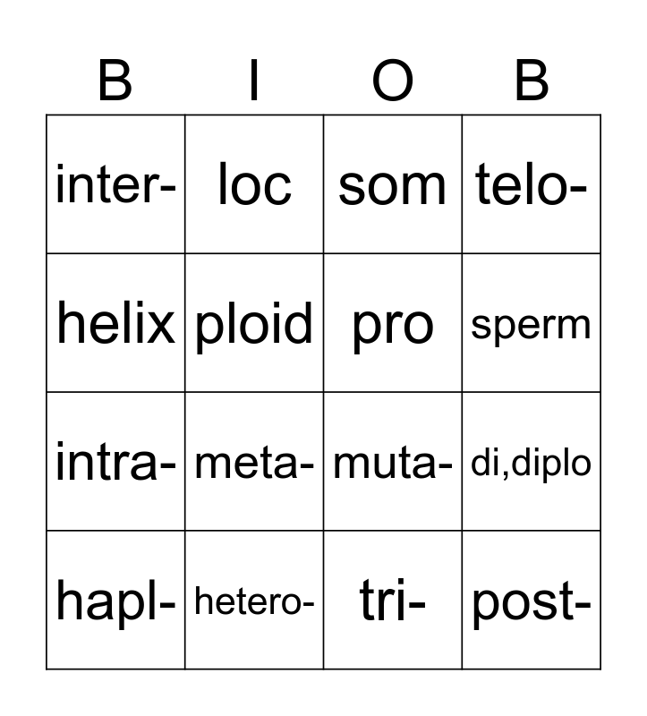 This bingo card has 20 words: di,diplo, chrom, som, -cyte, hapl-, helix, hetero-, inter-, intra-, loc, meta-, muta-, ploid, post-, pro, tetra, sperm, telo-, tri- and zyg.
