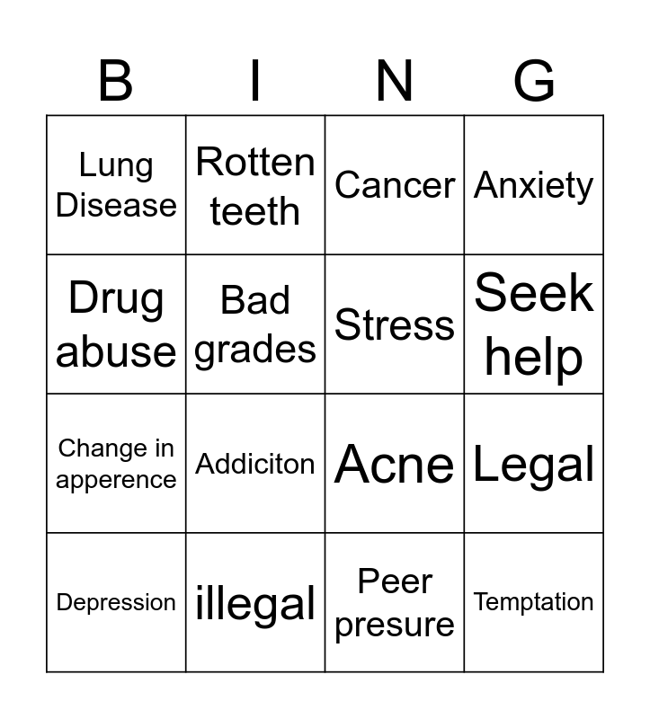 This bingo card has 16 words: illegal, Legal, Cancer, Lung Disease, Change in apperence, Rotten teeth, Acne, Peer presure, Drug abuse, Bad grades, Depression, Anxiety, Addiciton, Seek help, Stress and Temptation.