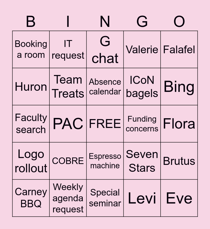 This bingo card has a free space and 24 words: COBRE, Weekly agenda request, Absence calendar, Carney BBQ, Falafel, Booking a room, Huron, IT request, Funding concerns, Espresso machine, ICoN bagels, Faculty search, Seven Stars, Brutus, Team Treats, Levi, Flora, G chat, Bing, PAC, Eve, Logo rollout, Valerie and Special seminar.