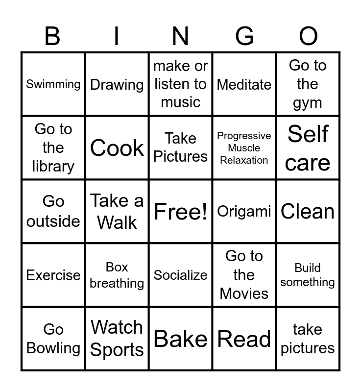 This bingo card has a free space and 24 words: Box breathing, Watch Sports, Take Pictures, Go Bowling, Go to the gym, Swimming, Go to the library, Drawing, Origami, Socialize, Progressive Muscle Relaxation, Go outside, Go to the Movies, Build something, Cook, Read, Clean, make or listen to music, Self care, Take a Walk, take pictures, Exercise, Meditate and Bake.