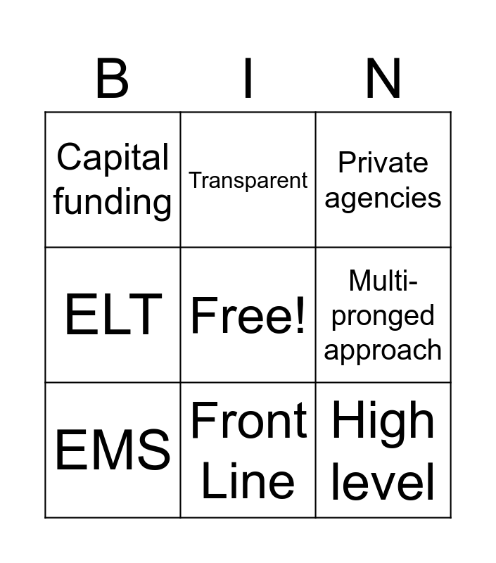 This bingo card has a free space and 41 words: Not aware, Interference, Open Communication, EMS, Rural Communities, Refocusing, Front Line, IFT, High level, Broader health care system, Important work, ELT, Practical, Arrives late, Minister of Health, Dollars, Funds, Capital funding, Service providers, Private agencies, Contract, Shared Services, Connect Care, Separate Entity, Core Mandates, Wait times, Move forward, Collaboration, Good Question, Investigations, Townhall, Transparent, Procurement, Alberta, Thank you, Multi-pronged approach, Timely, Unaware, Pleased, Intergration and Across the system.