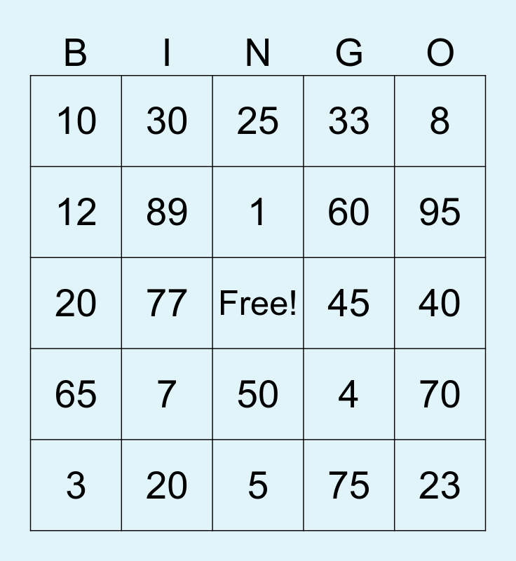 This bingo card has a free space and 24 words: 7, 20, 1, 3, 8, 10, 12, 30, 45, 50, 60, 20, 4, 70, 89, 75, 40, 25, 95, 77, 23, 65, 33 and 5.