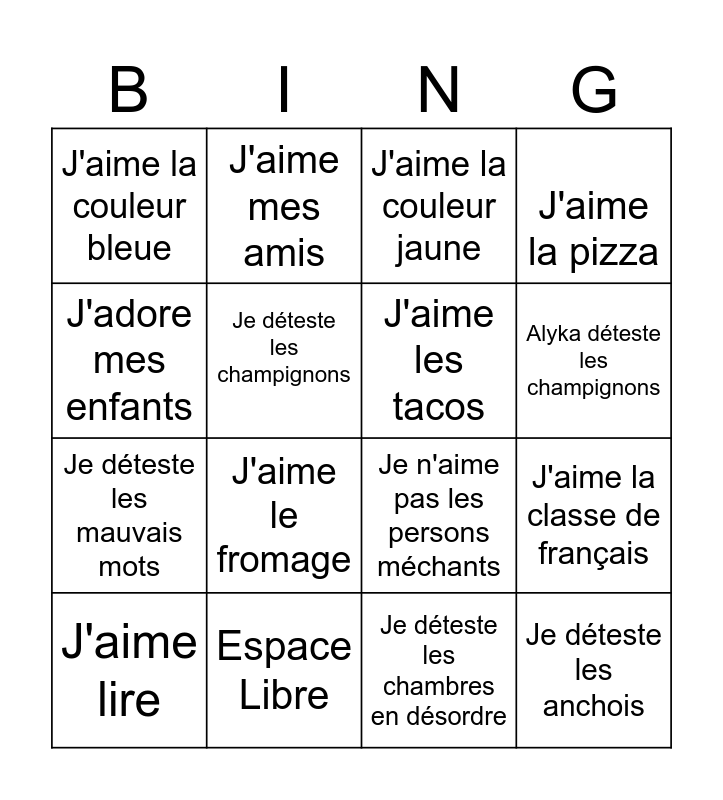 This bingo card has 25 words: Rosalie aime les bonbons, Loïc déteste les araignées, Alyka déteste les champignons, Je déteste les araignées, J'adore mes enfants, J'aime la couleur bleue, Je déteste les champignons, J'aime mes amis, Espace Libre, J'aime les sports, Je déteste les mauvais mots, Je n'aime pas les persons méchants, J'adore le thé vert, J'adore l'école, J'aime les tacos, J'aime regarder Netflix, Je déteste les chambres en désordre, J'aime la couleur jaune, J'aime le fromage, J'aime la classe de français, J'aime lire, Je n'aime pas le brocoli, Je déteste les anchois, J'aime la pizza and J'aime jouer au volleyball.