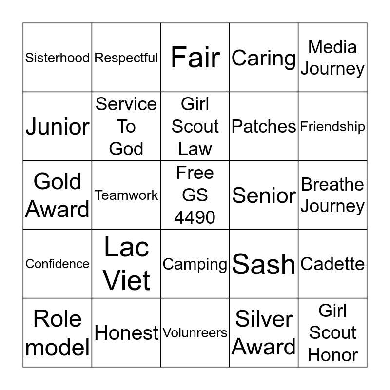 This bingo card has a free space and 24 words: Lac Viet, Honest, Girl Scout Law, Role model, Media Journey, Sisterhood, Junior, Respectful, Senior, Camping, Patches, Gold Award, Sash, Cadette, Service To God, Silver Award, Breathe Journey, Fair, Friendship, Teamwork, Girl Scout Honor, Confidence, Caring and Volunreers.