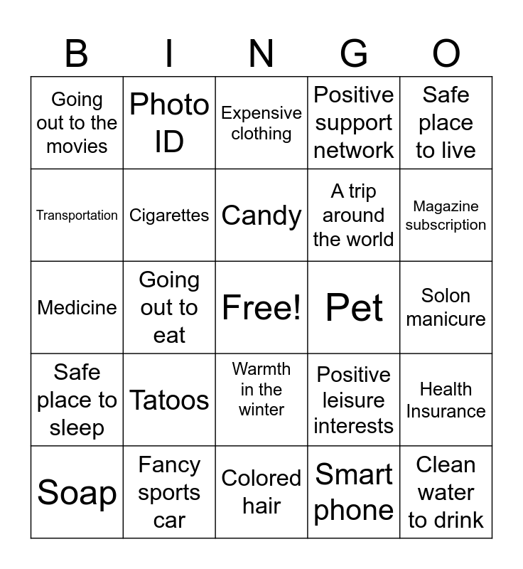 This bingo card has a free space and 35 words: Going to the Fair, Video games, Cable TV, Cigarettes, Warmth in the winter, Positive support network, Transportation, Soda, Candy, Clothes, Medicine, Safe place to live, Health food, Shampoo, Going out to the movies, Pet, Smart phone, Going out to eat, Safe place to sleep, Clean water to drink, Positive leisure interests, Soap, Health Insurance, Fancy sports car, Expensive clothing, Magazine subscription, Expensive jewelery, Access to oral care, A trip around the world, Solon manicure, Alcohol, Colored hair, Tatoos, Photo ID and p.