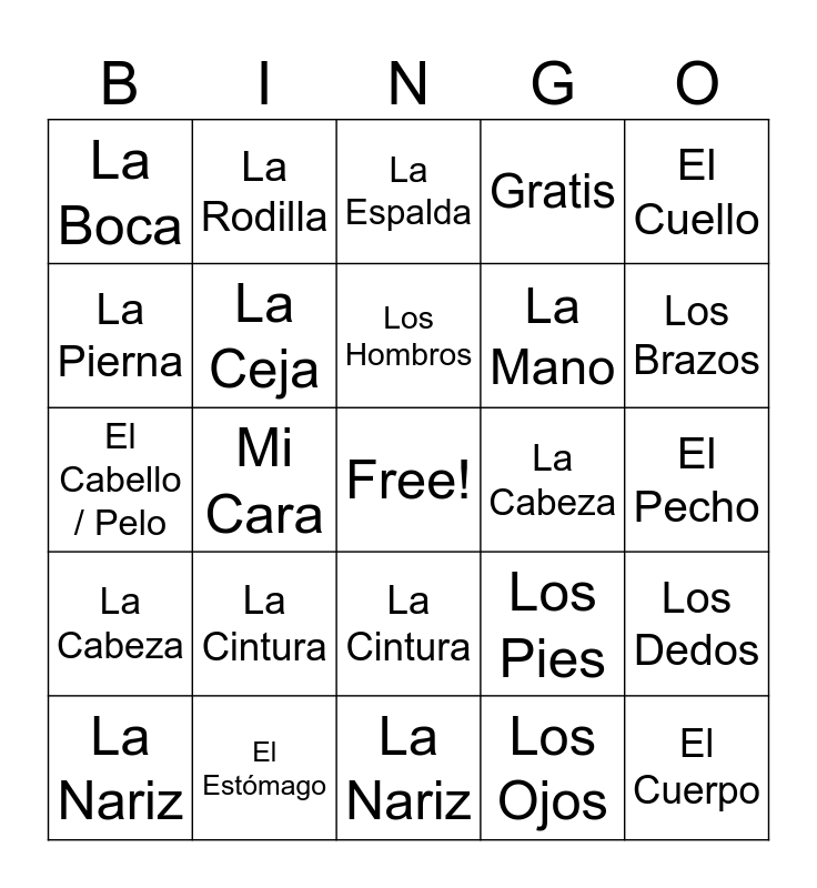 This bingo card has a free space and 24 words: La Cintura, El Estómago, Los Hombros, La Nariz, El Cuello, La Boca, La Pierna, La Rodilla, La Cabeza, La Cintura, La Mano, El Cabello / Pelo, Los Pies, Los Dedos, La Ceja, Los Ojos, El Pecho, La Espalda, Los Brazos, Mi Cara, El Cuerpo, La Cabeza, Gratis and La Nariz.