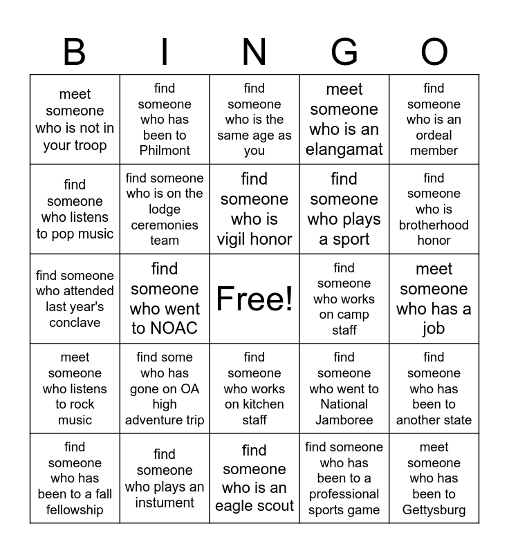 This bingo card has a free space and 24 words: find some who has gone on OA high adventure trip, find someone who plays an instument, find someone who is vigil honor, find someone who has been to a fall fellowship, find someone who is an ordeal member, meet someone who is not in your troop, find someone who listens to pop music, find someone who has been to Philmont, find someone who works on camp staff, find someone who works on kitchen staff, find someone who plays a sport, find someone who attended last year's conclave, find someone who went to National Jamboree, find someone who has been to another state, find someone who is on the lodge ceremonies team, find someone who has been to a professional sports game, meet someone who has a job, find someone who is the same age as you, find someone who is brotherhood honor, find someone who went to NOAC, meet someone who has been to Gettysburg, meet someone who listens to rock music, meet someone who is an elangamat and find someone who is an eagle scout.