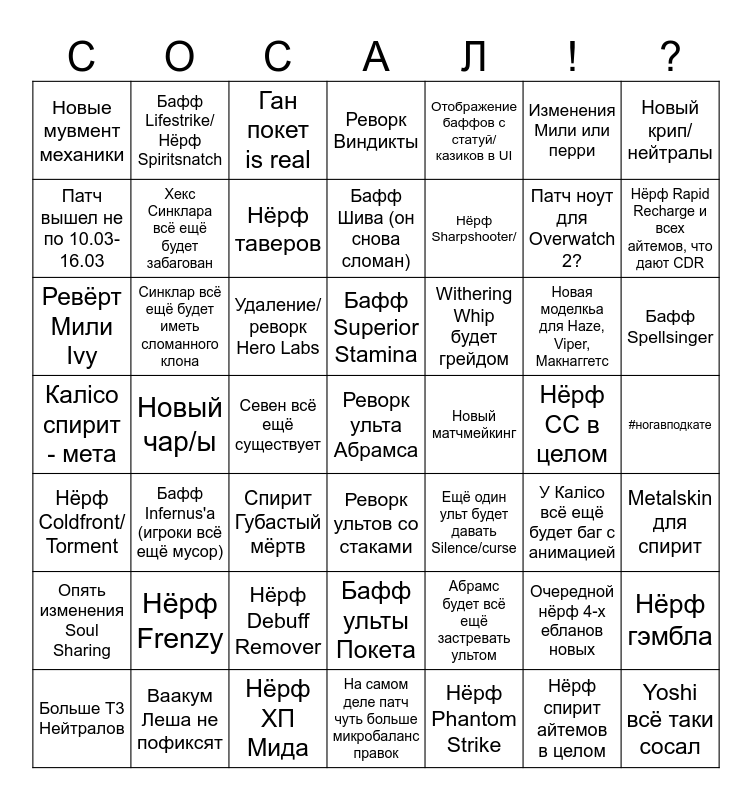 This bingo card has a free space and 48 words: Абрамс будет всё ещё застревать ультом, Патч ноут для Overwatch 2?, На самом деле патч чуть больше микробаланс правок, Новый чар/ы, Удаление/реворк Hero Labs, #ногавподкате, Бафф Lifestrike/Нёрф Spiritsnatch, Ваакум Леша не пофиксят, Изменения Мили или перри, Реворк ультов со стаками, Новый крип/нейтралы, Реворк Виндикты, Новая моделкьа для Haze, Viper, Макнаггетс, Withering Whip будет грейдом, Опять изменения Soul Sharing, Нёрф CC в целом, Патч вышел не по 10.03-16.03, Нёрф Rapid Recharge и всех айтемов, что дают CDR, Очередной нёрф 4-х ебланов новых, Отображение баффов с статуй/казиков в UI, Нёрф Sharpshooter/, Севен всё ещё существует, Новые мувмент механики, Хекс Синклара всё ещё будет забагован, Нёрф гэмбла, Нёрф таверов, Бафф Spellsinger, Больше T3 Нейтралов, Бафф Superior Stamina, Синклар всё ещё будет иметь сломанного клона, Нёрф спирит айтемов в целом, Новый матчмейкинг, Metalskin для спирит, Нёрф Frenzy, Калico спирит - мета, Ещё один ульт будет давать Silence/curse, У Калico всё ещё будет баг с анимацией, Ревёрт Мили Ivy, Спирит Губастый мёртв, Нёрф Debuff Remover, Нёрф Coldfront/ Torment, Yoshi всё таки сосал, Ган покет is real, Нёрф ХП Мида, Бафф Шива (он снова сломан), Бафф ульты Покета, Бафф Infernus'а (игроки всё ещё мусор) and Нёрф Phantom Strike.