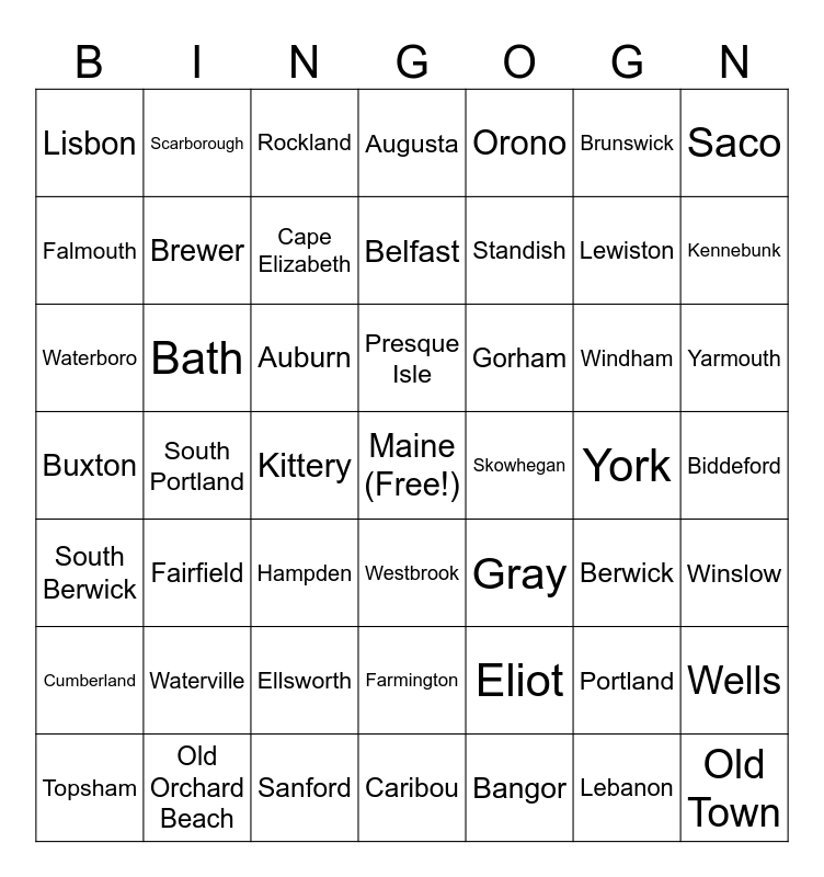 This bingo card has a free space and 49 words: Portland, Lewiston, Bangor, South Portland, Auburn, Biddeford, Scarborough, Sanford, Brunswick, Westbrook, Saco, Augusta, Windham, Gorham, Waterville, York, Falmouth, Kennebunk, Wells, Orono, Standish, Kittery, Lisbon, Brewer, Topsham, Cape Elizabeth, Yarmouth, Old Orchard Beach, Presque Isle, Bath, Freeport, Skowhegan, Cumberland, Ellsworth, Buxton, Gray, Berwick, Winslow, Waterboro, Hampden, Farmington, South Berwick, Old Town, Caribou, Belfast, Rockland, Eliot, Fairfield and Lebanon.