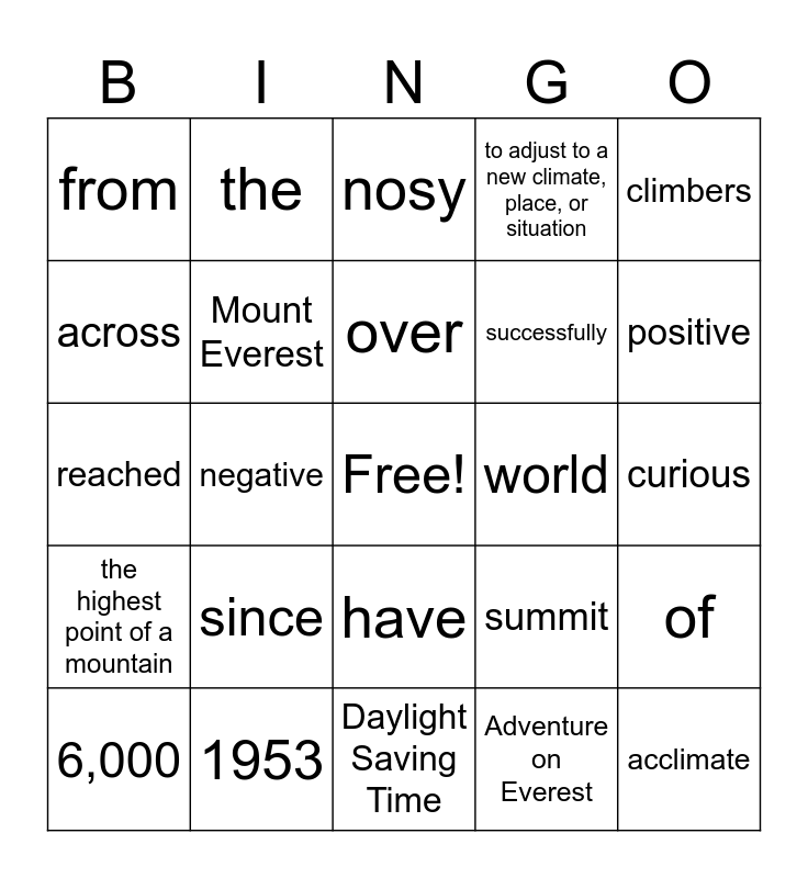 This bingo card has a free space and 24 words: since, 1953, over, 6,000, climbers, from, across, the, world, have, successfully, reached, summit, of, Mount Everest, Adventure on Everest, curious, nosy, positive, negative, acclimate, the highest point of a mountain, to adjust to a new climate, place, or situation and Daylight Saving Time.