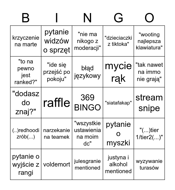 This bingo card has a free space and 24 words: narzekanie na teamek, voldemort, błąd językowy, pytanie o wyjście z rangi, "wooting najlepsza klawiatura", krzyczenie na marte, "to na pewno jest ranked?", pytanie widzów o sprzęt, "siatafakap", "wszystkie ustawienia na moim dc", mycie rąk, "dodasz do znaj?", pytanie o myszki, "(...)tier 1/tier2(...)", "ide się przejść po pokoju", justyna i alkohol mentioned, stream snipe, "nie ma nikogo z moderacji", "tak nawet na immo nie grają", raffle, wyzywanie turasów, (..)redhoodi zrób(...), "dzieciaczki z tiktoka" and julesgranie mentioned.