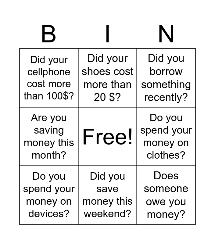 This bingo card has a free space and 20 words: Are you saving money this year?, Did you lend money to someone recently?, Did you borrow something recently?, Do you earn money doing chores?, Did you sell something this year?, Does someone owe you money?, Do you have change?, Did your cellphone cost more than 100$?, Do you owe money to someone?, Did your shoes cost more than 20 $?, Can you lend me 1$?, Can I borrow your cellphone for 1 hour?, Do you spend your money on clothes?, Do you spend your money on food?, Do you spend your money on devices?, Do you spend your money on transport?, Did you save money this weekend?, Are you saving money this month?, Are you saving money to buy a present? and Are you saving money to for Mother's Day?.