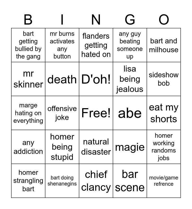 This bingo card has a free space and 24 words: homer being stupid, bart doing shenanegins, D'oh!, homer strangling bart, bart and milhouse, bart getting bullied by the gang, mr skinner, mr burns activates any button, abe, natural disaster, lisa being jealous, marge hating on everything, magie, homer working randoms jobs, death, bar scene, eat my shorts, flanders getting hated on, sideshow bob, offensive joke, movie/game refrence, any addiction, any guy beating someone up and chief clancy.