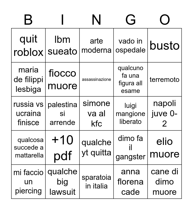 This bingo card has 25 words: +10 pdf, sparatoia in italia, assassinazione, mi faccio un piercing, busto, quit roblox, maria de filippi lesbiga, lbm sueato, luigi mangione liberato, qualche yt quitta, qualcuno fa una figura all esame, russia vs ucraina finisce, dimo fa il gangster, elio muore, fiocco muore, cane di dimo muore, napoli juve 0-2, arte moderna, terremoto, palestina si arrende, simone va al kfc, qualche big lawsuit, qualcosa succede a mattarella, vado in ospedale and anna florena cade.