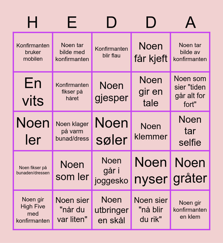 This bingo card has 25 words: Noen som ler, Noen utbringer en skål, Noen gjesper, Noen gir High Five med konfirmanten, Noen tar bilde av konfirmanten, Konfirmanten bruker mobilen, En vits, Noen tar bilde med konfirmanten, Noen klemmer, Noen går i joggesko, Noen gir en tale, Noen ler, Noen nyser, Noen gråter, Konfirmanten fikser på håret, Noen gir konfirmanten en klem, Noen tar selfie, Konfirmanten blir flau, Noen som sier "tiden går alt for fort", Noen klager på varm bunad/dress, Noen søler, Noen sier "når du var liten", Noen fikser på bunaden/dressen, Noen får kjeft and Noen sier "nå blir du rik".