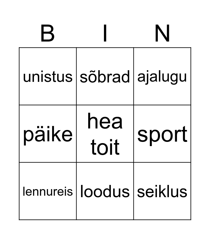 This bingo card has a free space and 8 words: sport, ajalugu, sõbrad, lennureis, unistus, seiklus, päike and loodus.