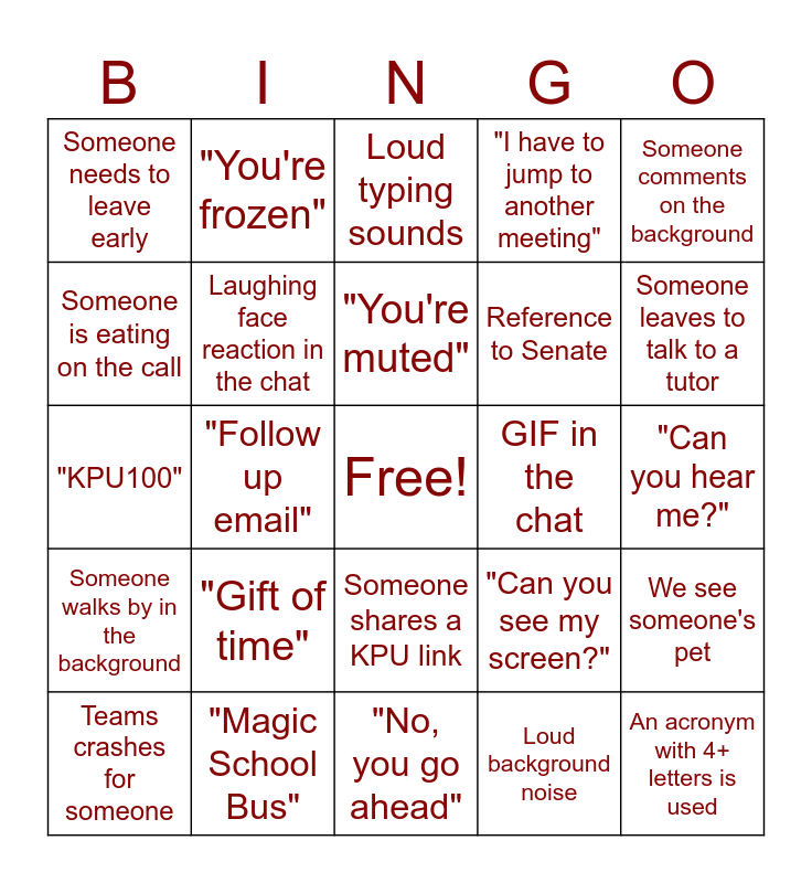 This bingo card has a free space and 24 words: "Gift of time", "Magic School Bus", "You're muted", Teams crashes for someone, Someone comments on the background, Someone needs to leave early, Someone is eating on the call, "You're frozen", GIF in the chat, Someone shares a KPU link, Reference to Senate, "KPU100", "Can you see my screen?", We see someone's pet, Laughing face reaction in the chat, Loud background noise, "Can you hear me?", Loud typing sounds, Someone leaves to talk to a tutor, "Follow up email", An acronym with 4+ letters is used, Someone walks by in the background, "I have to jump to another meeting" and "No, you go ahead".