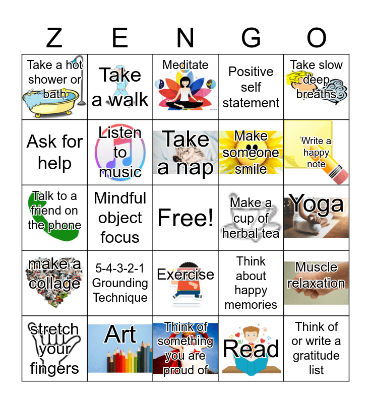 This bingo card has 18 images, a free space and 24 words: 5-4-3-2-1 Grounding Technique, Art, Take a nap, stretch your fingers, Take slow deep breaths, Take a hot shower or bath, Ask for help, Take a walk, Make a cup of herbal tea, Exercise, Make someone smile, Talk to a friend on the phone, Think about happy memories, Muscle relaxation, Listen to music, Read, Yoga, Meditate, Write a happy note, Mindful object focus, Think of or write a gratitude list, make a collage, Positive self statement and Think of something you are proud of.