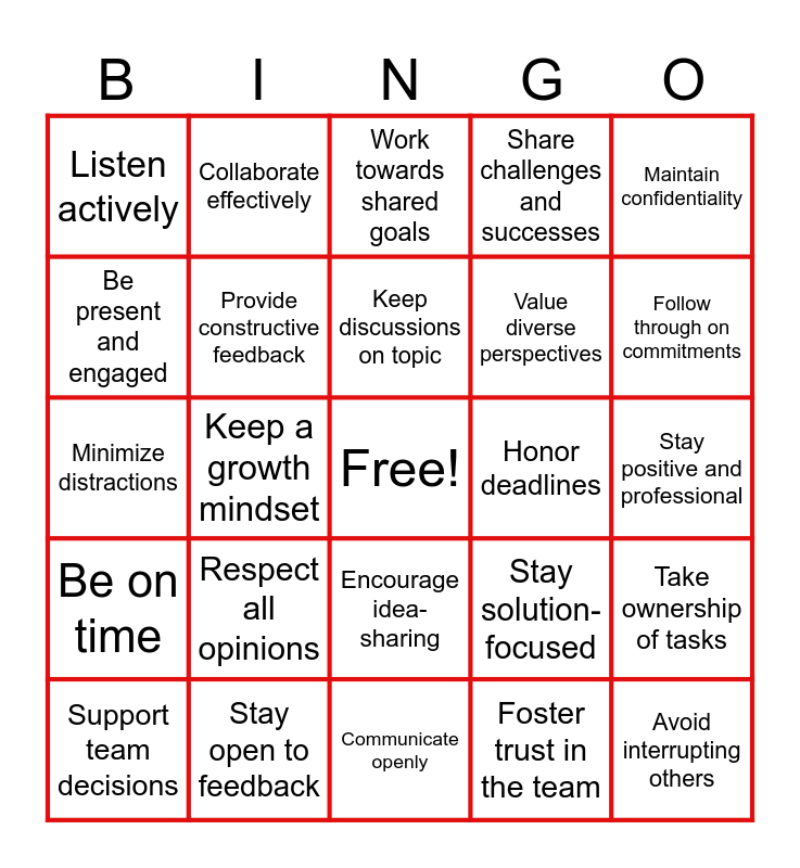 This bingo card has a free space and 24 words: Respect all opinions, Stay open to feedback, Keep discussions on topic, Support team decisions, Maintain confidentiality, Listen actively, Be present and engaged, Collaborate effectively, Honor deadlines, Encourage idea-sharing, Value diverse perspectives, Minimize distractions, Stay solution-focused, Take ownership of tasks, Provide constructive feedback, Foster trust in the team, Stay positive and professional, Work towards shared goals, Follow through on commitments, Keep a growth mindset, Avoid interrupting others, Be on time, Share challenges and successes and Communicate openly.