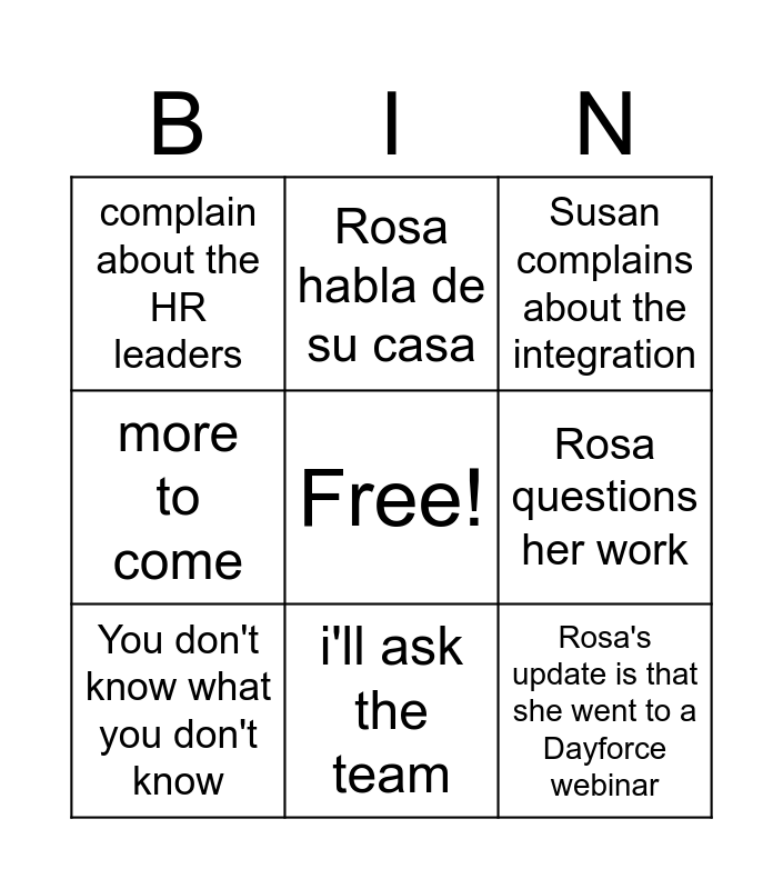 This bingo card has a free space and 8 words: Rosa questions her work, Susan complains about the integration, Rosa habla de su casa, You don't know what you don't know, complain about the HR leaders, Rosa's update is that she went to a Dayforce webinar, more to come and i'll ask the team.