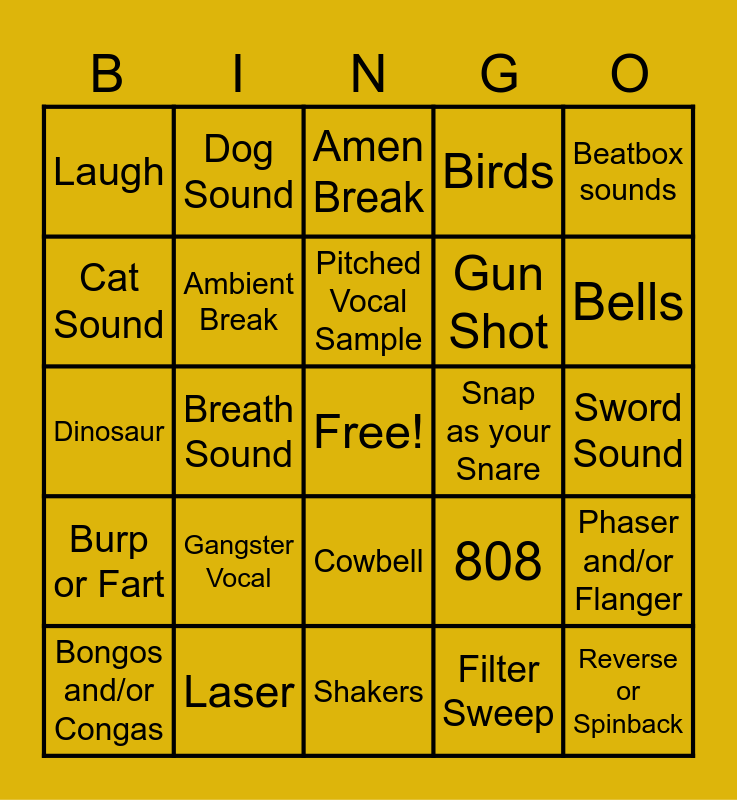 This bingo card has a free space and 24 words: Gangster Vocal, Laser, Pitched Vocal Sample, Bongos and/or Congas, Beatbox sounds, Laugh, Cat Sound, Dog Sound, Snap as your Snare, Cowbell, Gun Shot, Dinosaur, 808, Phaser and/or Flanger, Ambient Break, Filter Sweep, Sword Sound, Amen Break, Bells, Breath Sound, Reverse or Spinback, Burp or Fart, Birds and Shakers.