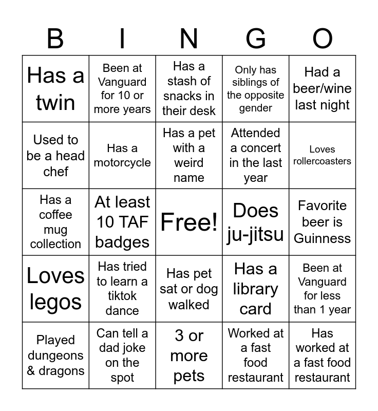 This bingo card has a free space and 29 words: Played dungeons & dragons, Played a sport in college, At least 10 TAF badges, Only child, Has a twin, Has a stash of snacks in their desk, Has a motorcycle, Has tried to learn a tiktok dance, Does ju-jitsu, Can tell a dad joke on the spot, Favorite beer is Guinness, Has worked at a fast food restaurant, 3 or more pets, Worked at a fast food restaurant, Loves rollercoasters, Plays guitar, Has pet sat or dog walked, Loves legos, Had a beer/wine last night, Has a coffee mug collection, Has a library card, Used all their VTO last year, Attended a concert in the last year, Used to be a head chef, Only has siblings of the opposite gender, Been at Vanguard for 10 or more years, Been at Vanguard for less than 1 year, Has a pet with a weird name and Always starts their day with coffee.