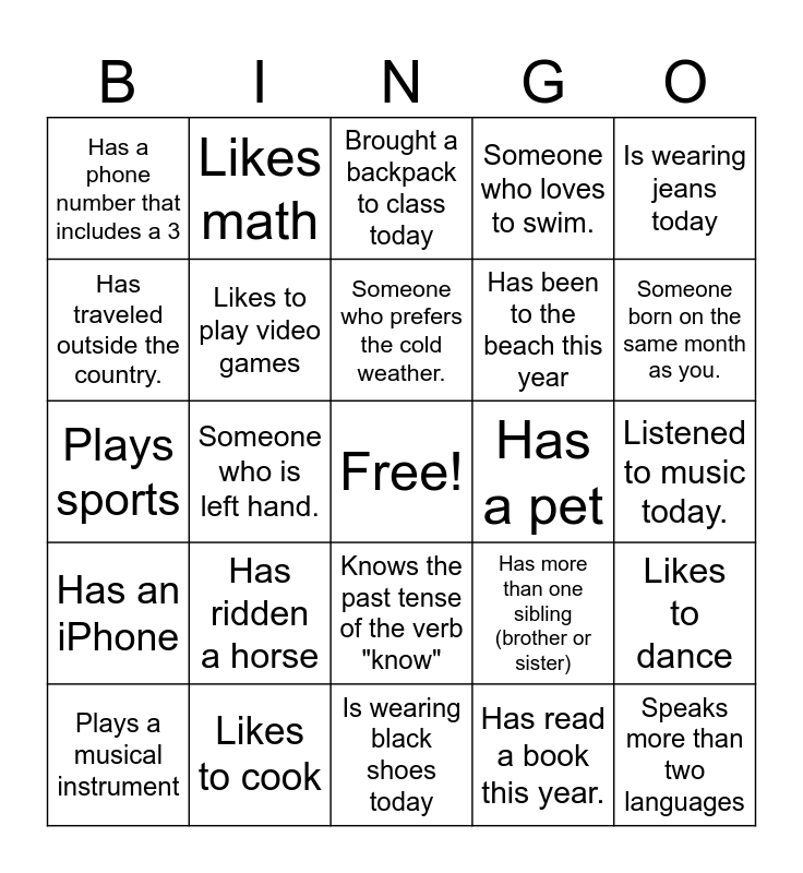 This bingo card has a free space and 24 words: Has ridden a horse, Likes to cook, Someone who prefers the cold weather., Plays a musical instrument, Is wearing jeans today, Has a phone number that includes a 3, Has traveled outside the country., Likes math, Has a pet, Knows the past tense of the verb "know", Has been to the beach this year, Plays sports, Has more than one sibling (brother or sister), Likes to dance, Likes to play video games, Has read a book this year., Listened to music today., Brought a backpack to class today, Someone born on the same month as you., Someone who is left hand., Speaks more than two languages, Has an iPhone, Someone who loves to swim. and Is wearing black shoes today.