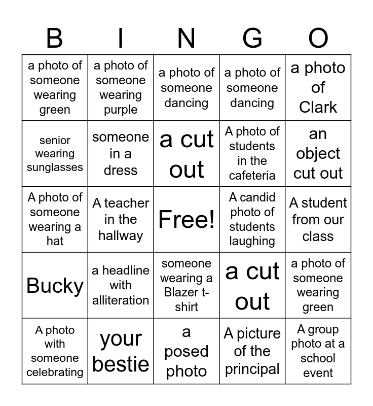 This bingo card has a free space and 29 words: A photo with someone celebrating, A page with more than 20 or more photos, A teacher in the hallway, A student with a sibling in the yearbook, a photo of someone wearing green, a photo of someone dancing, someone in a dress, a headline with alliteration, A candid photo of students laughing, your bestie, A student from our class, A group photo at a school event, a posed photo, A picture of the principal, an object cut out, Food, someone wearing a Blazer t-shirt, Bucky, a photo of Clark, A photo of someone wearing a hat, a cut out, A picture from a school trip, A photo of students in the cafeteria, senior wearing sunglasses, a photo of someone dancing, a photo of someone wearing purple, a photo of someone wearing green, a cut out and an object cut out.