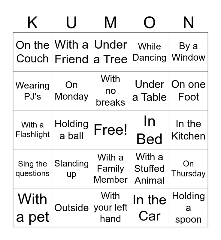 This bingo card has a free space and 24 words: Standing up, Outside, With no breaks, With a pet, By a Window, On the Couch, Wearing PJ's, With a Friend, In Bed, With a Family Member, Under a Table, With a Flashlight, With a Stuffed Animal, On Thursday, On Monday, In the Car, In the Kitchen, Under a Tree, On one Foot, Holding a ball, Holding a spoon, Sing the questions, While Dancing and With your left hand.