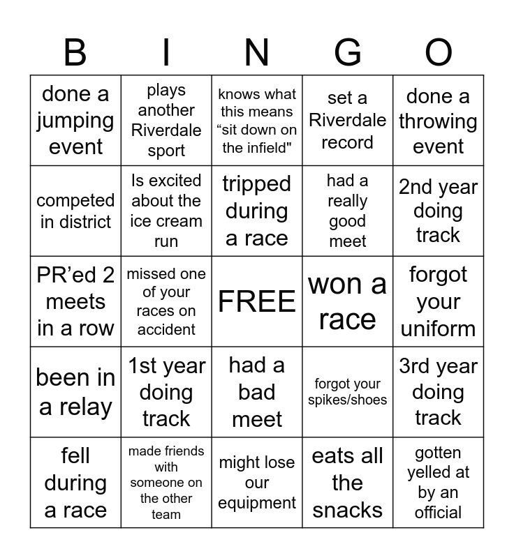 This bingo card has a free space and 24 words: 1st year doing track, made friends with someone on the other team, tripped during a race, fell during a race, done a throwing event, done a jumping event, competed in district, plays another Riverdale sport, won a race, had a bad meet, had a really good meet, PR’ed 2 meets in a row, forgot your spikes/shoes, 3rd year doing track, Is excited about the ice cream run, eats all the snacks, forgot your uniform, knows what this means “sit down on the infield", 2nd year doing track, missed one of your races on accident, gotten yelled at by an official, been in a relay, set a Riverdale record and might lose our equipment.